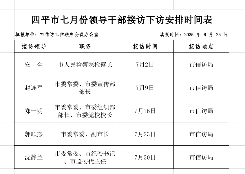 四平市领导干部七月份接访下访安排时间表