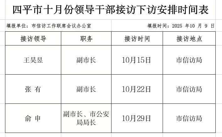 四平市领导干部十月份接访下访安排时间表