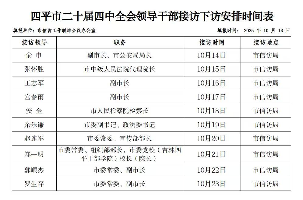 四平市二十届四中全会领导干部接访下访安排时间表