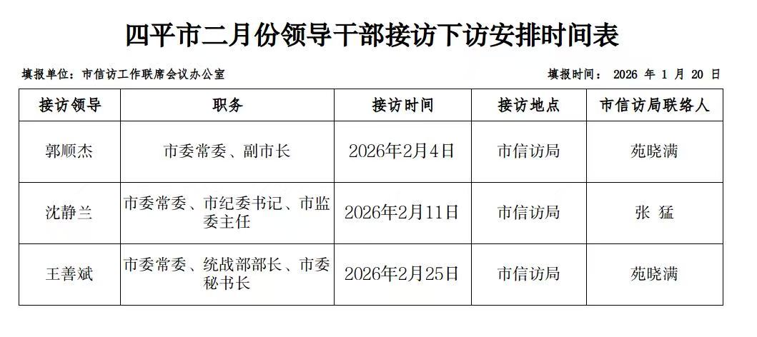 四平市领导干部2026年2月份接访下访安排时间表