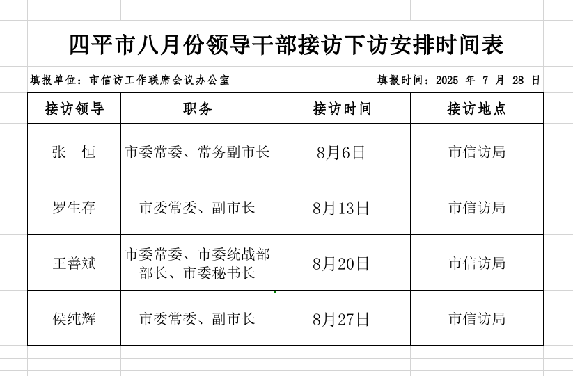 四平市领导干部八月份接访下访安排时间表